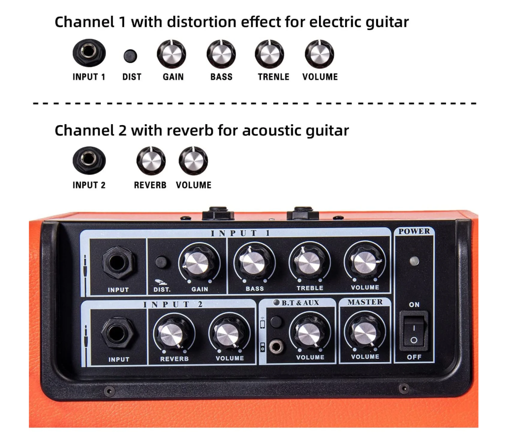 Hai đầu vào: Input 1 cho guitar Electric hoặc guitar Acoustic, Input 2 cho Microphone