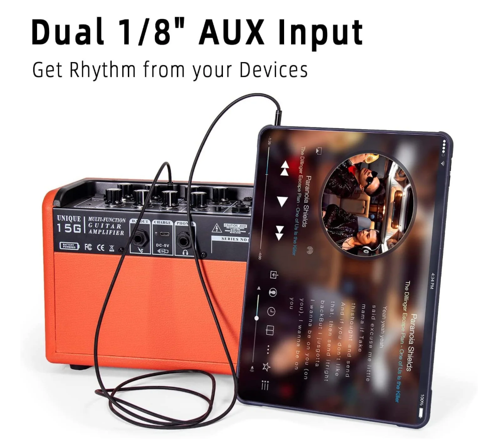Được tích hợp bluetooth và đầu vào 3.5mm có thể phát nhạc nền. Amplifier Unique 15G, bổ xung các chức năng ghi âm, bạn có thể ghi lại những bản nhạc bạn đã chơi. Sau khi kết nối với điện thoại di động thông qua cáp âm thanh 6.5mm, chức năng "ghi trực tiếp" có thể được thực hiện.
