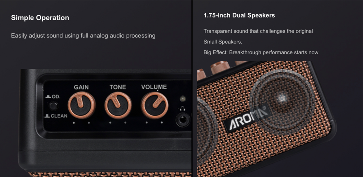 Aroma AG-04 là bộ khuếch đại mini có thể sạc lại dành cho guitar điện, có thiết kế đơn giản và nhỏ gọn, dễ mang theo và sử dụng, dễ bật hiệu ứng overdrive và nhanh chóng, chất lượng tốt nhất cho loa bluetooth.