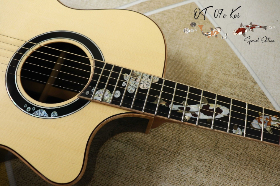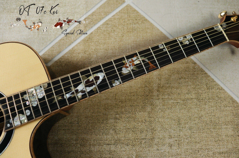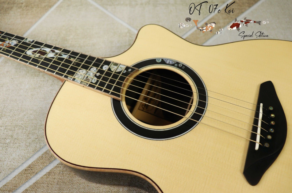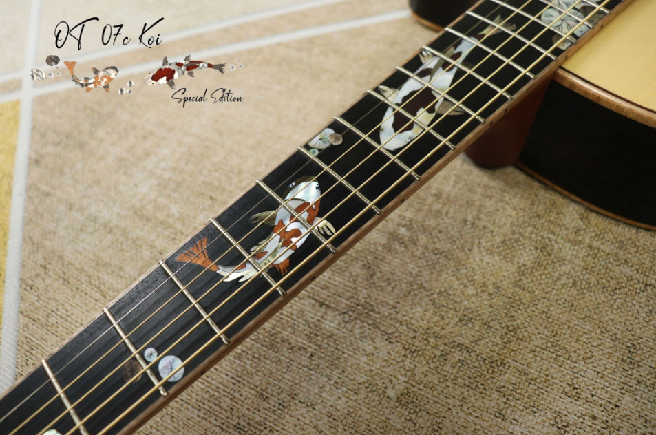 OT-07C KOI (SPECIAL EDITION) 2024 Cấu hình:- Body shape: OM with Cutaway- Bevels: None- Top: Solid 5A Engelamm Spruce- Back and Sides: Solid Master Ziricote- Fingerboard: Ebony- Bridge: Ebony- Neck: 1 Piece Mahogany (2 lines)- Nut and Saddle: Bone-...