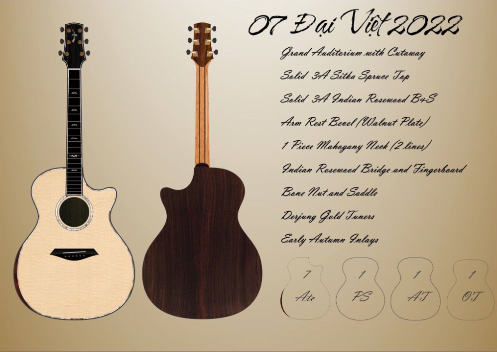 Thuận Guitar AT - 07 CX Custom Đại Việt Cấu Hình- Body shape: Grand Auditorium with cutaway- Bevels: Arm Rest- Top: 3A Sitka Spruce- Back and Sides: 3A Indian Rosewood- Fingerboard: Ebony-...